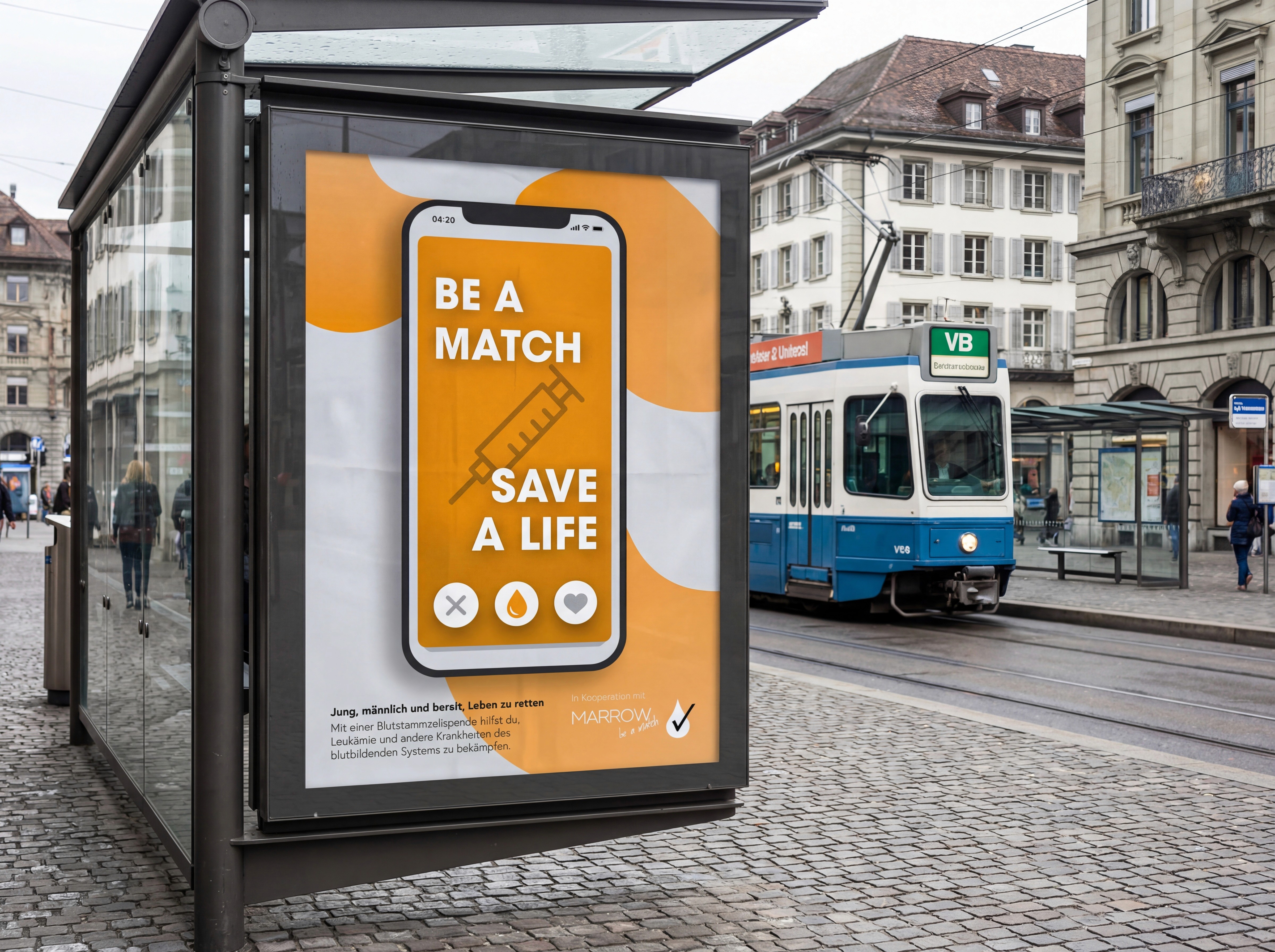 «Be a match» entstand als kreatives Abschlussprojekt zum Thema Blutstammzellspende. Die Organisation Marrow Switzerland setzt sich dafür ein, dass möglichst viele Patienten mit lebensbedrohlichen Blutkrankheiten durch Stammzellspenden weiterleben können. Das Problem: Junge Menschen registrieren sich zu selten als potenzielle Spender.